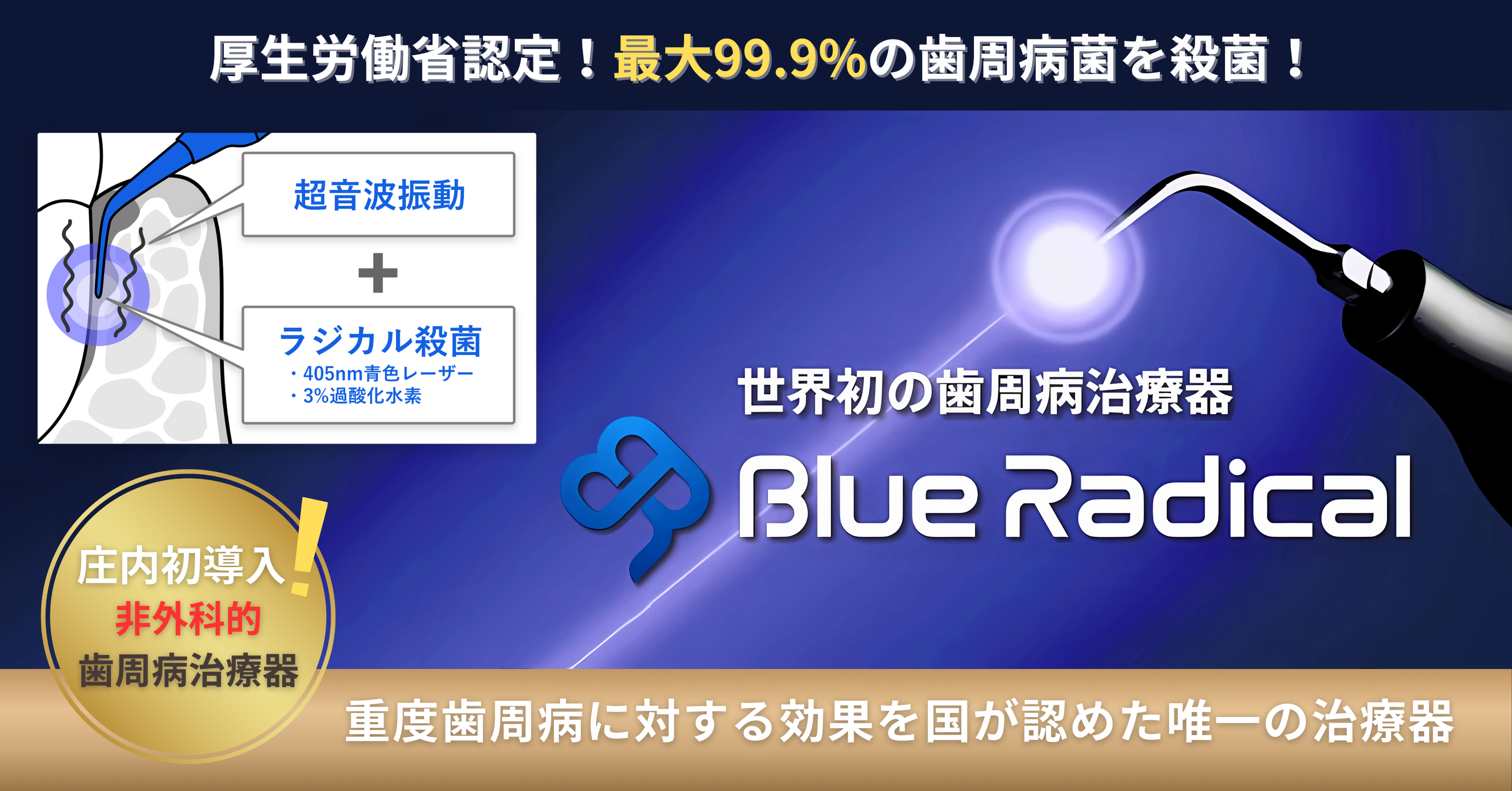 庄内地域で初導入となる『ブルーラジカル P-01』は、重度歯周病に対して外科処置を行うことなく治療が可能な治療器です。「歯周病が改善しない」「もう抜歯しかない」と諦める前に、まずは当院にご相談ください。