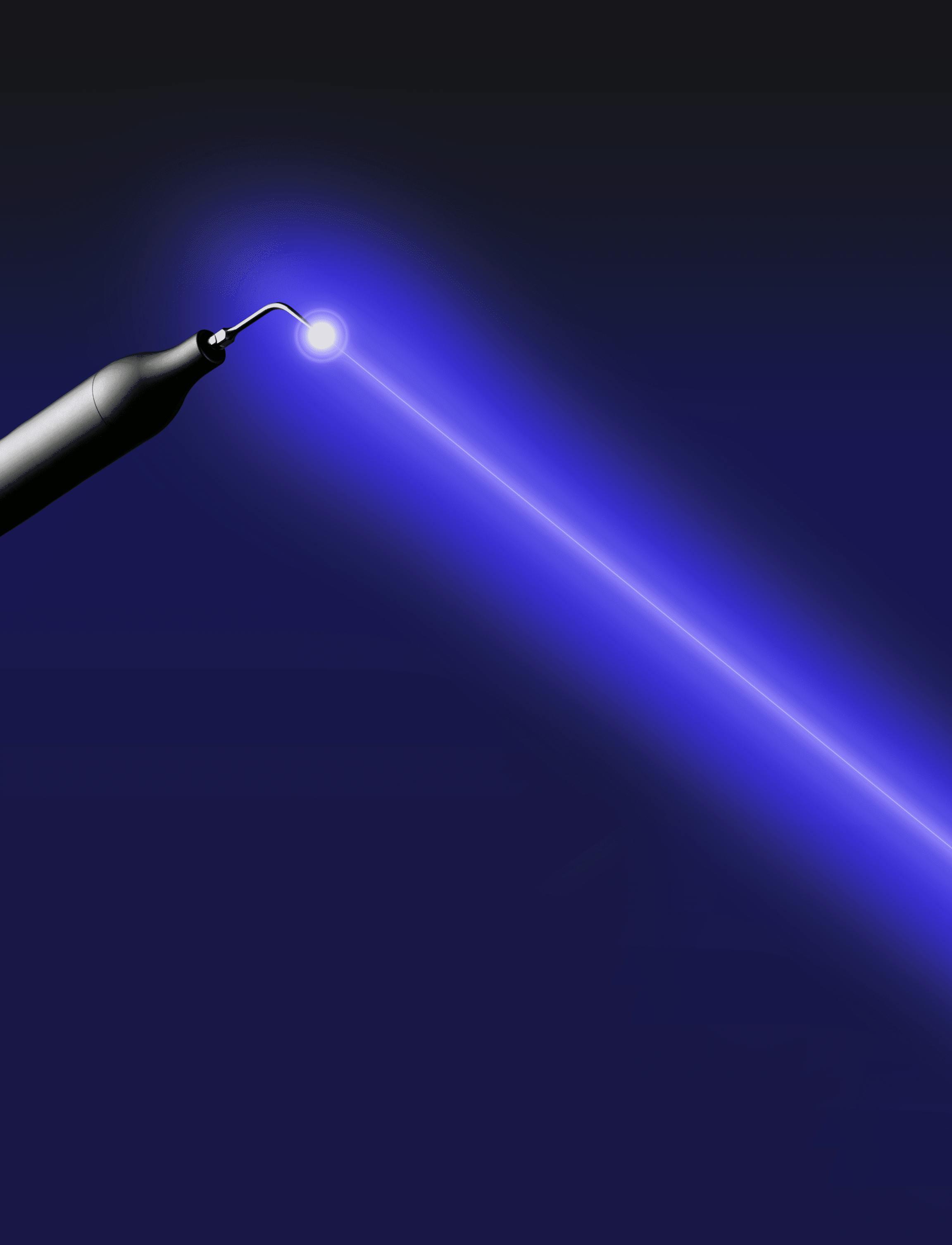 「ブルーラジカル P-01」は、特殊な青色光と過酸化水素水を反応させて発生する「ヒドロキシラジカル」の強力な酸化作用で、歯周ポケット内の細菌を最大99.99%殺菌する新しい歯周病治療器です。従来の治療では届きにくかった原因菌にも作用し、外科手術なしで進行抑制や症状の安定化が期待できます。